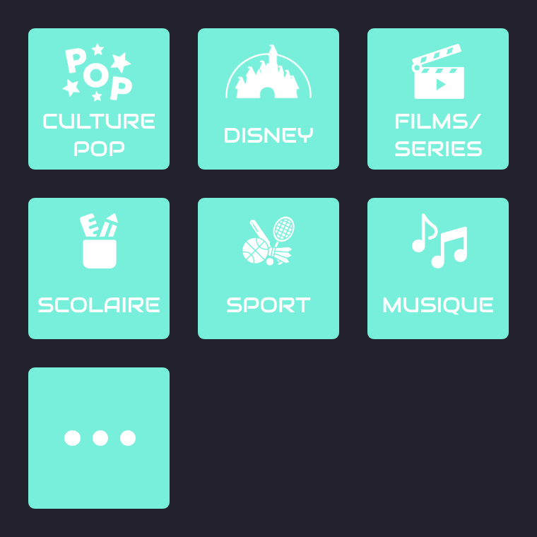 Au cours de la partie, vous allez être questionné sur une multitude de thèmes avec des milliers de questions aléatoire posées sur chacun d’eux. Sélectionnez les bien pour avoir un maximum de chance de répondre correctement aux questions et marquer un max de points !